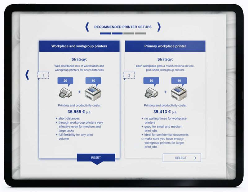 Die Gesamtkostenrechnung hört nicht bei dem Kompromiss zwischen einmaligen und wiederkehrenden Kosten auf. Unsere Guided Selling Tools bieten Beratung zwischen verschiedenen Setups und Installationsstrategien. Nehmen Sie zum Beispiel Drucker - Sie können einen großen Drucker für die gesamte Abteilung verwenden oder viele kleinere Drucker über das Büro verteilt. Mit digitaler Beratung können Sie Ihren Kunden alle verfügbaren Optionen anbieten und ihnen zeigen, welche im Laufe der Zeit am meisten Kosten spart.