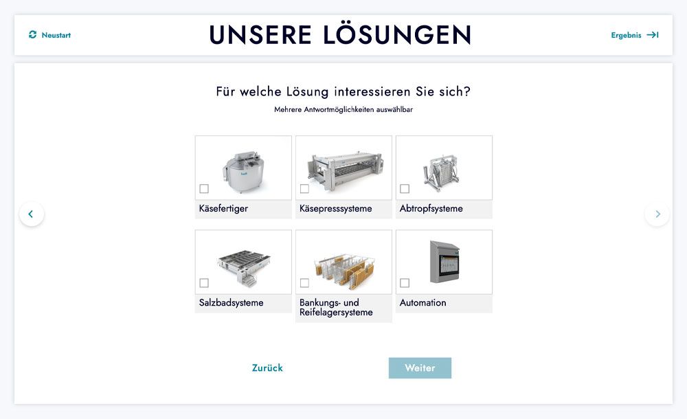 Produktfinder: Verfügt ein Unternehmen beispielsweise über eine große Anzahl an verschiedenen Lösungen und bietet zusätzlich dazu noch weitere Dienstleistungen und Services an, ist ein klassischer Produktfinder optimal geeignet, um für jeden Kunden genau die richtige Empfehlung zu generieren.