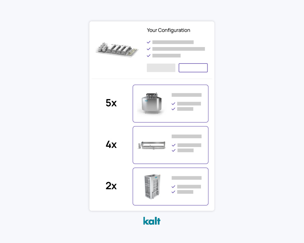 Product configurators can calculate complex relationships and thereby provide perfect recommendations. This can also be best explained with a practical example: The 2D Cheese Technology Configurator from Kalt assembles a complete solution for cheese production. The configurator determines not only which machines are needed but also how many.