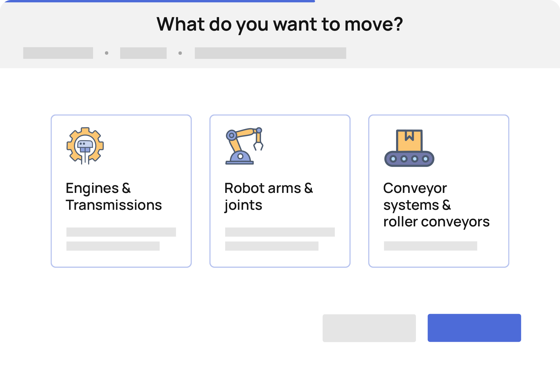 A digital product finder asks simple yet industry-specific questions that the customer can answer step by step. For example, a product finder for bearings might ask: *“What would you like to move?”* *“What does your work environment look like?”* or *“What types of loads are involved?”*