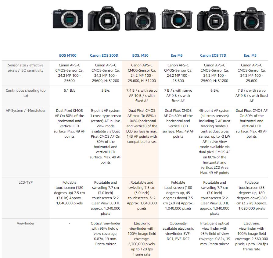 E.g. let’s assume a customer wants to buy a new DSLR camera, but is relatively new to photography. They will face confusion when they come across certain details such as, ISO sensitivity, focal length, shutter speed, etc. When comparing models too, they will come across a table as shown below: