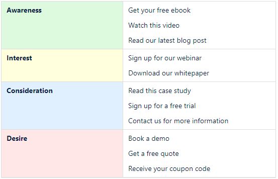 CTA's (call-to-action) prevent you from losing your customers and make it easier for them to interact with you. Check out some example CTAs which you could use for different parts of the funnel.