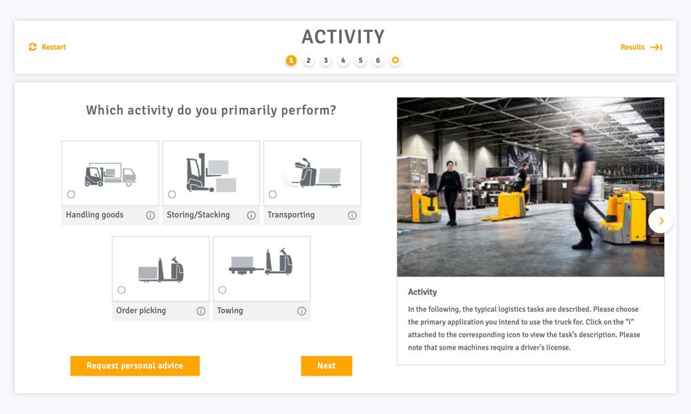 Jungheinrich's forklift Advisor guides to the perfect recommendation in just a few clicks.