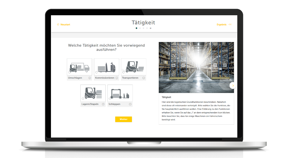 The Product Guide gives an option for customers to connect with Jungheinrich at each stage of the advisory process. It contains features such as PDF generation, product comparisons, and lead generation functionalities. It also offers video explanation content and smart preselections, making it easier for customers to select specific product features.
