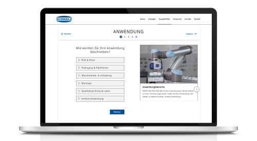 The Schmalz Product Advisor uncomplicates the advisory process for website visitors, especially when they work with particular types of materials and technical specifications. Explanation content is used to understand precise details and to highlight robot compatibility. It has also been translated into multiple languages.