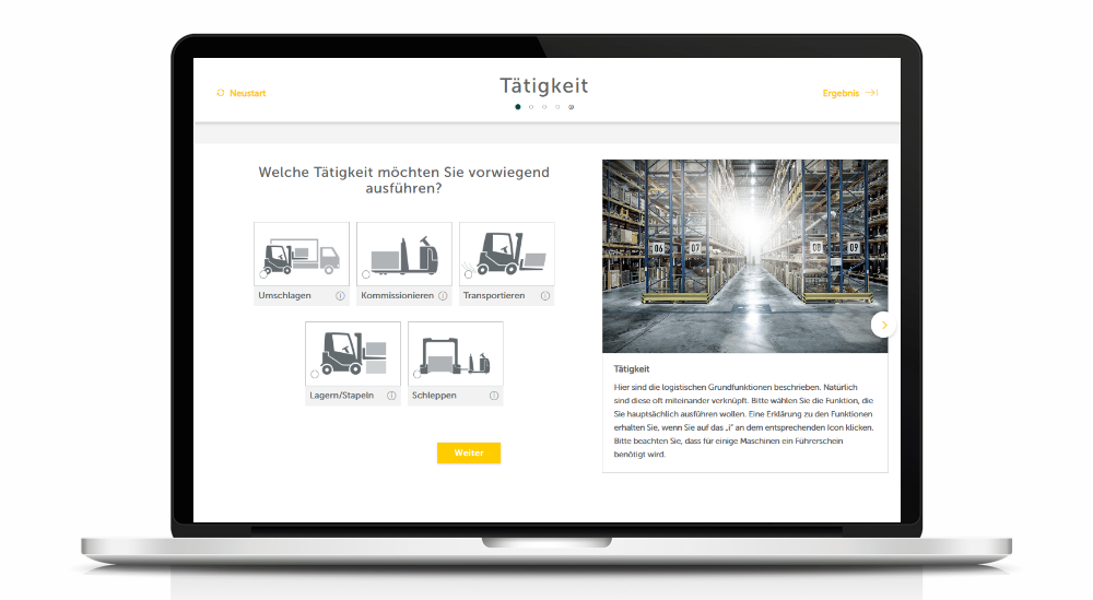 The Product Guide gives an option for customers to connect with Jungheinrich at each stage of the advisory process. It contains features such as PDF generation, product comparisons, and lead generation functionalities. It also offers video explanation content and smart preselections, making it easier for customers to select specific product features.